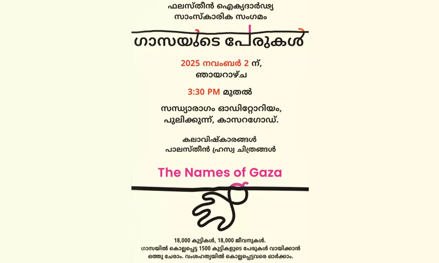 ഗാസയില് കൊല്ലപ്പെട്ട 15000 കുട്ടികളുടെ പേരുകള് വായിക്കുന്നു; കാസര്കോട്ട് സാംസ്കാരിക സംഗമം 2ന്
