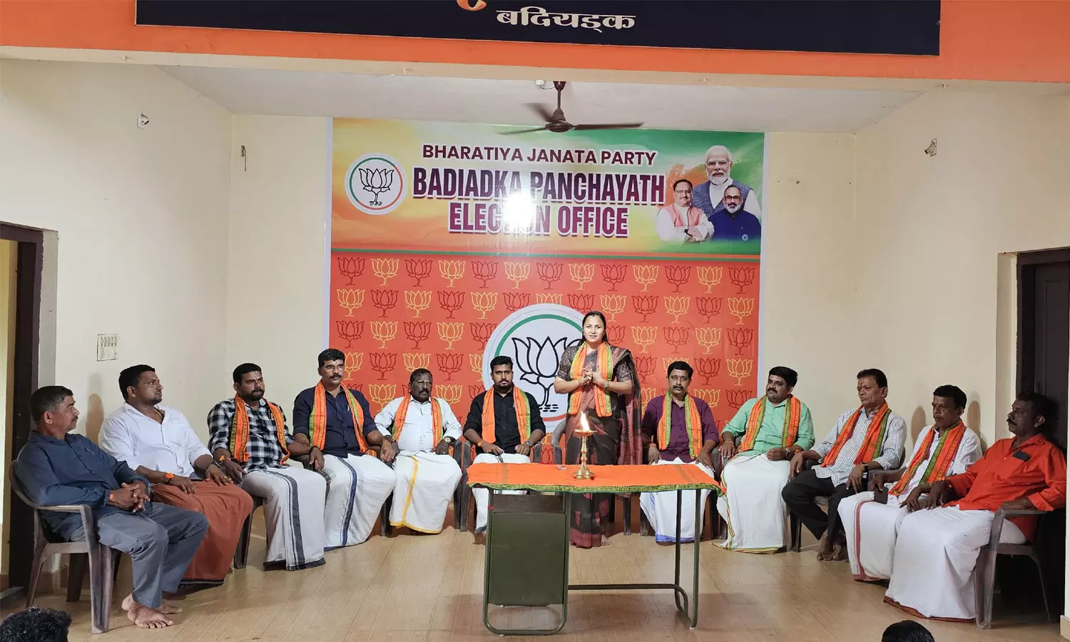 ബി.ജെ.പി ബദിയടുക്ക പഞ്ചായത്ത് തിരഞ്ഞെടുപ്പ് സമിതി ഓഫീസ് ഉദ്ഘാടനം ചെയ്ത് ജില്ലാ പ്രസിഡണ്ട് എം.എല് അശ്വിനി സംസാരിക്കുന്നു