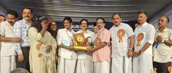 സര്വീസില് നിന്ന് വിരമിക്കുന്ന ജില്ലാ വിദ്യാഭ്യാസ ഉപഡയറക്ടര് ടി.വി മധുസൂദനന് ജില്ലാ സ്കൂള് കലോത്സവ വേദിയില് സംഘടിപ്പിച്ച യാത്രയയപ്പ് ചടങ്ങില് ഉപഹാരം നല്കുന്നു